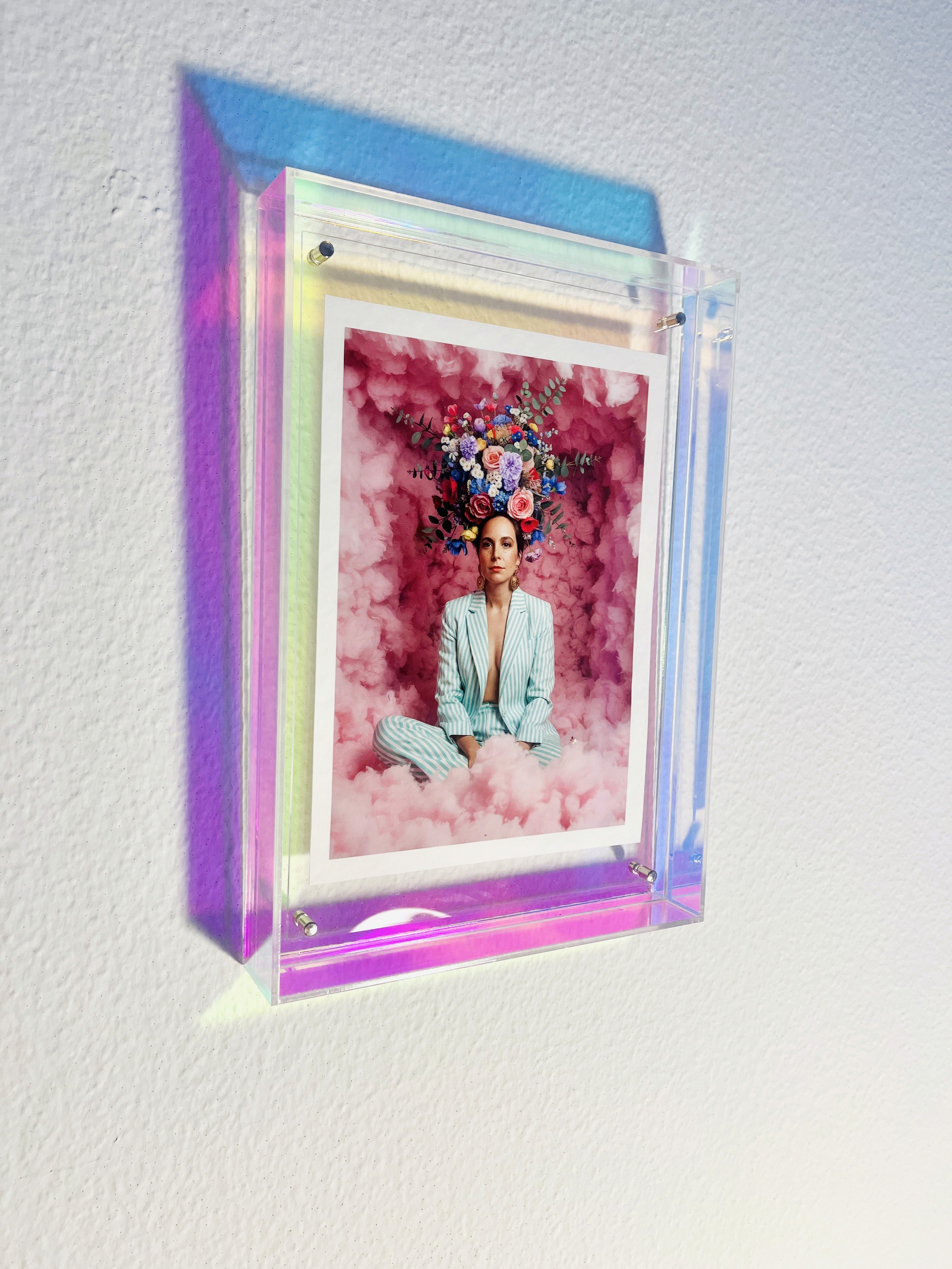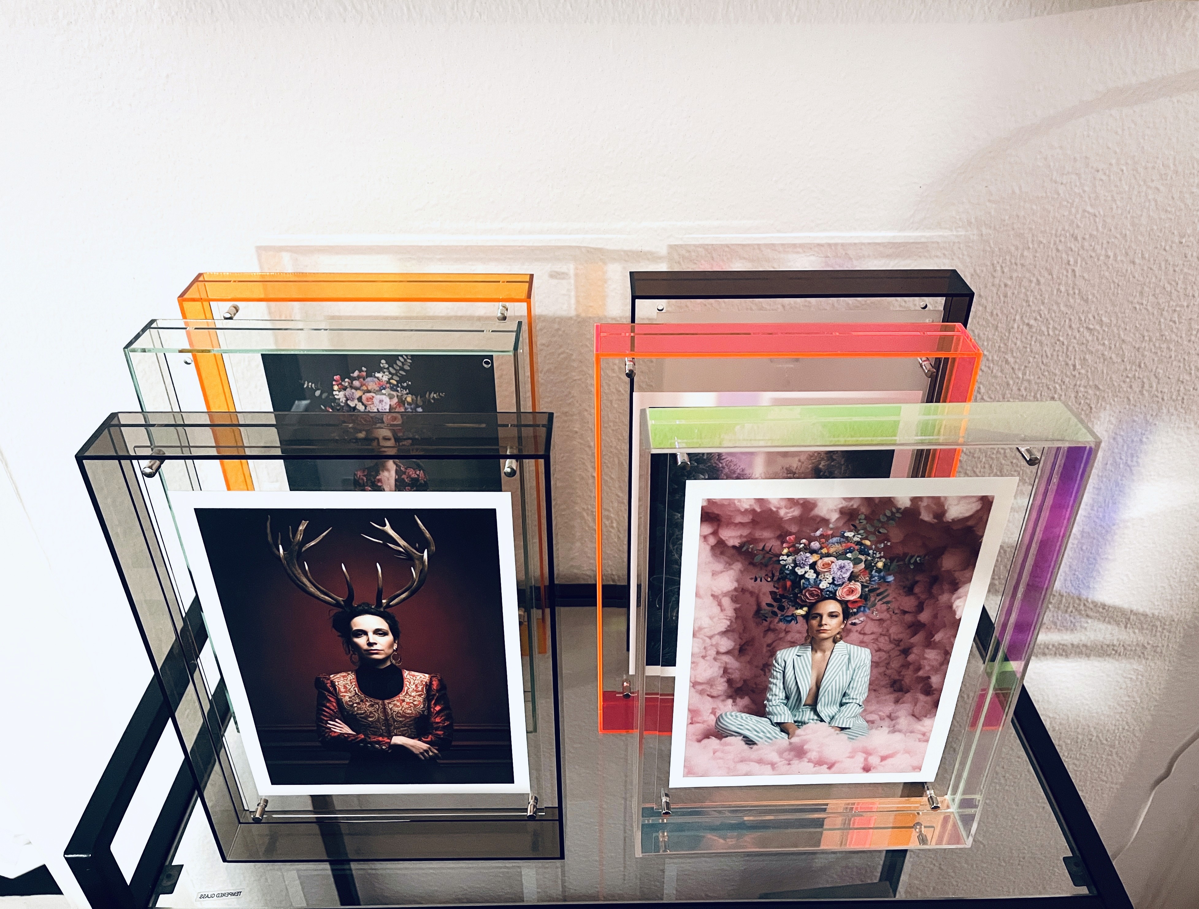Es gibt 6 verschiedene Acrylglas-Rahmen-Farben zur Auswahl. Diese kann dann individuell zum kreierten Porträt ausgewählt werden.